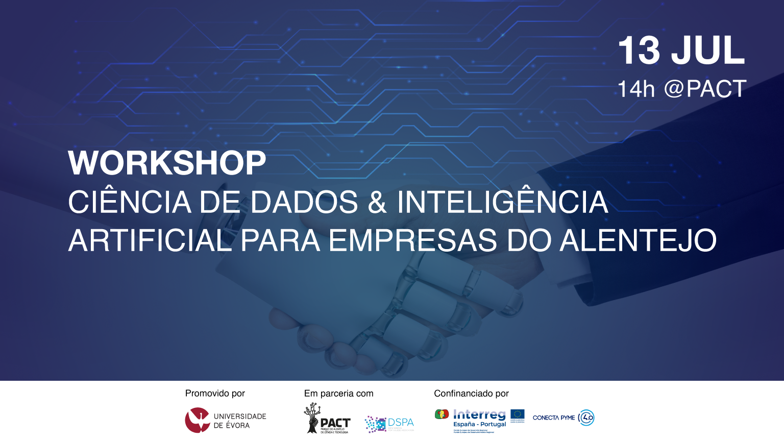No âmbito do projeto Conecta Pyme 4.0, a Universidade de Évora, em parceria com a Data Science Portuguese Association (DSPA) e o PACT, está a promover no dia 13 de julho, às 14h no PACT- Parque do Alentejo de Ciência e Tecnologia, o workshop “Ciência de Dados & Inteligência Artificial para Empresas do Alentejo”.